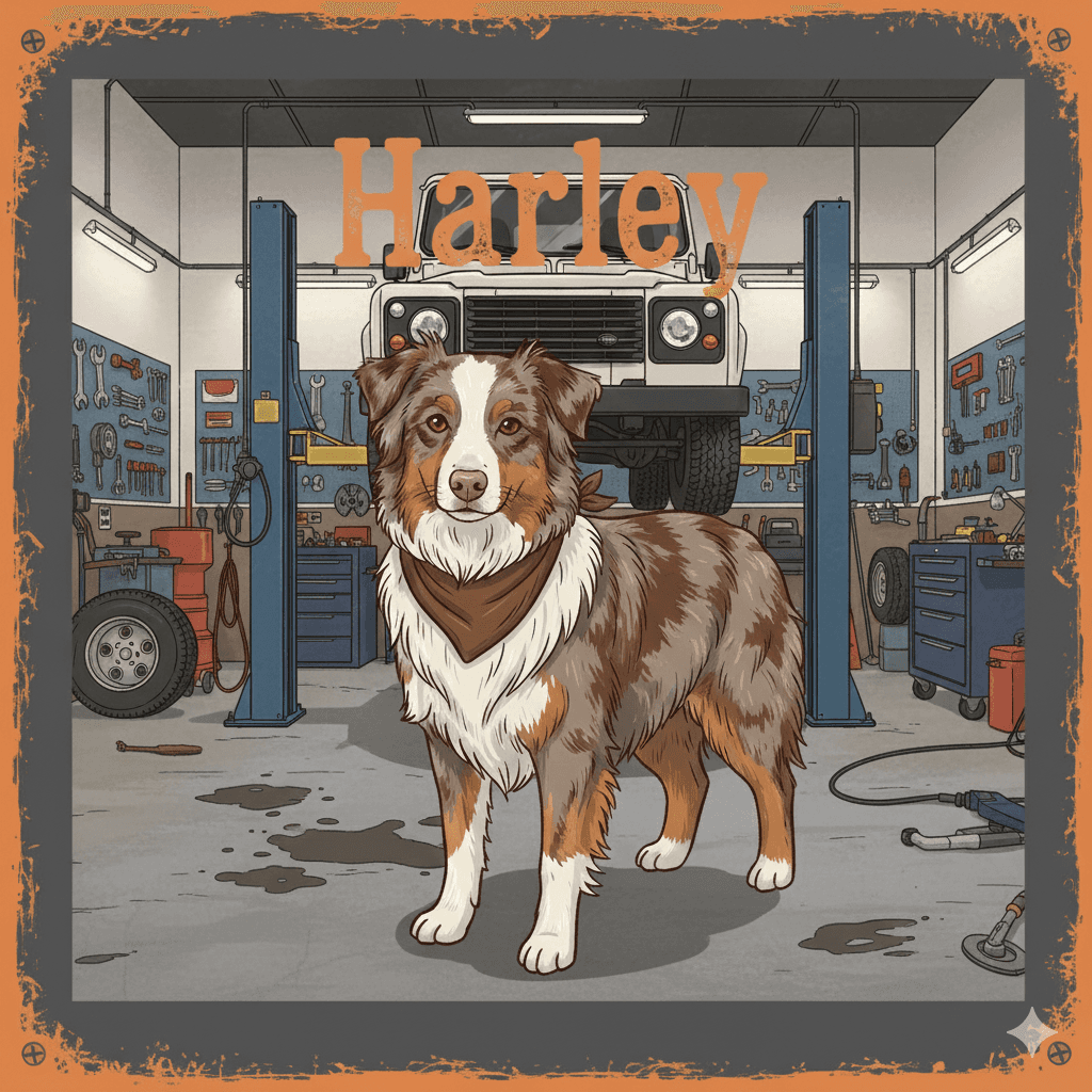 The Shop Foreman. With typical Aussie Shepherd focus, Harley ensures the workflow remains as precise as a freshly tuned Rover V8. If a bolt is out of place, she’s the first to know.